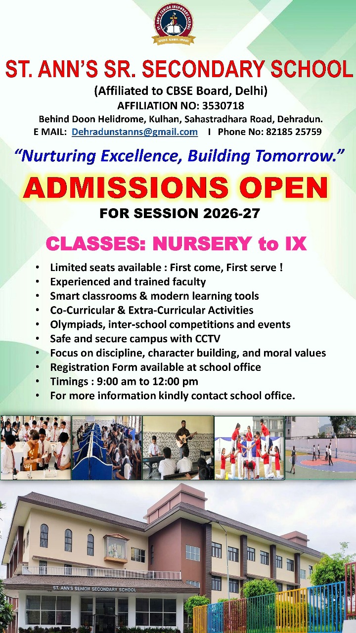 Imbibing the modern thoughts and ideas of the changing world and adapting novel methods of education, St. Ann's School takes off on its success journey, with a view of molding up a new generation. The school adheres to the CBSE Scheme and is owned by the society of Sisters of St. Ann, Province of Northern India, and managed by St. Ann's Convent, Dehradun.